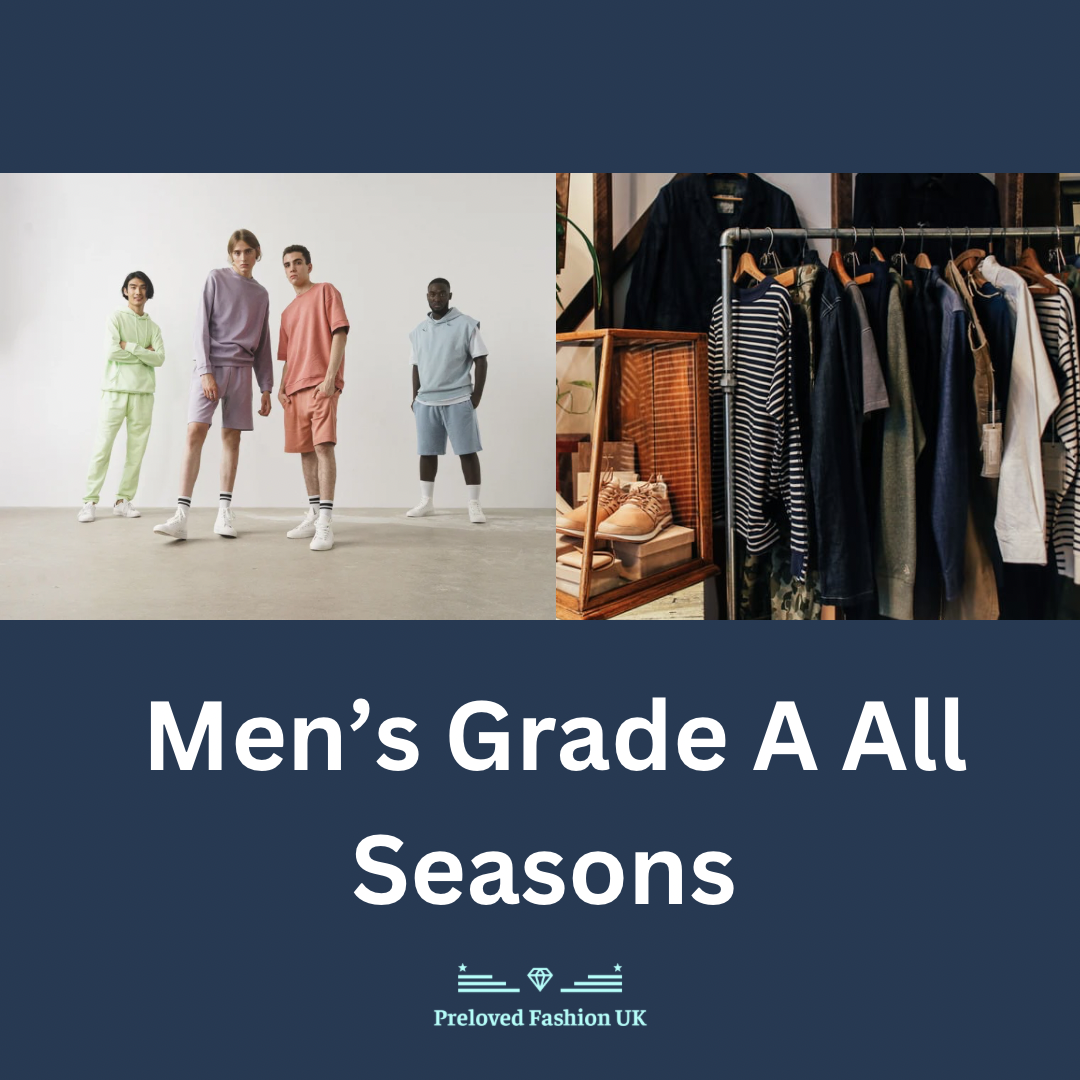 Grade A mens clothes All Seasons. All clothes are in perfect condition and don’t have any imperfections but please be aware there may have been something I have missed like a small mark, fading, bobbles ect due to human error so please allow some room for some waste. Some items may have the label cut out but they will always have size labels. Includes jackets, tops, trousers , shorts , shirts, suits and more ! All seasons ! Photos show examples. Could be any brand. Any size. There will be no underwear or socks. There is a lot of high street brands such as M&S, Boohoo, George , F&F , Next and more !