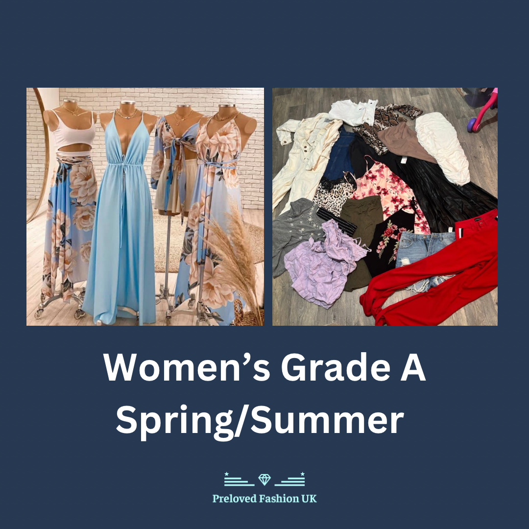 Grade A women’s clothes. All clothes are in perfect condition and don’t have any imperfections but please be aware there may have been something we have missed like a small mark, bobbles, fading ect due to human error so please allow some room for some waste. Some items may have the label cut out but they will always have size labels .Includes tops, trousers , shorts, dresses and more ! Only clothes suitable for Spring/Summer ! Photos show examples. Could be any brand. Any size. There will be no underwear or socks. mainly high street brands such as M&S, Yours, George , F&F , Zara, FatFace, Misguided ,ASOS, Next , Boohoo, PLT and more !